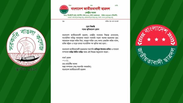 রাসেল রানা,বাঙলা কলেজ প্রতিনিধি সরকারি বাঙলা কলেজ শাখা ছাত্রদলের পাঁচ নেতাকে সংগঠনের পদ থেকে স্থগিতাদেশ দেওয়া হয়েছে। কেন্দ্রীয় ছাত্রদল জানিয়েছে, দায়িত্বে অবহেলা ও শৃঙ্খলা ভঙ্গের অভিযোগে এই পদক্ষেপ নেওয়া হয়েছে।