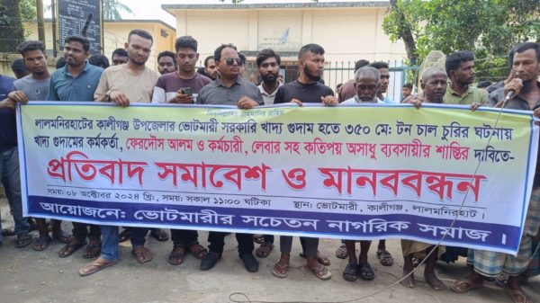 লালমনিরহাট সংবাদদাতা লালমনিরহাটের কালীগঞ্জ উপজেলার ভোটমারী সরকারি খাদ্য গুদাম থেকে ৩৫০ মেঃ টন চাল চুরির ঘটনায় খাদ্য গুদামের কর্মকর্তা ফেরদৌস আলম ও কর্মচারী,লেবারসহ কতিপয় অসাধু ব্যবসায়ীর শাস্তির দাবিতে মানববন্ধন করেছে