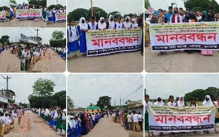 কে এম শহীদুল সুনামগঞ্জ: সুনামগঞ্জের ধর্মপাশাননঞ উপজেলার পাইকুরাটি ইউনিয়নের বাদশাগঞ্জ বাজারে তিন শিক্ষা প্রতিষ্টানের শিক্ষার্থীদের সমন্নেয়ে মানববন্ধন অনুষ্টিত হয়েছে। রবিবার দুপুরে বাদশাগঞ্জ পাবলিক বালিকা উচ্চ বিদ্যালয়ের সামনের রাস্তায় এ মানববন্ধন