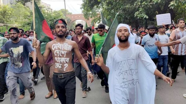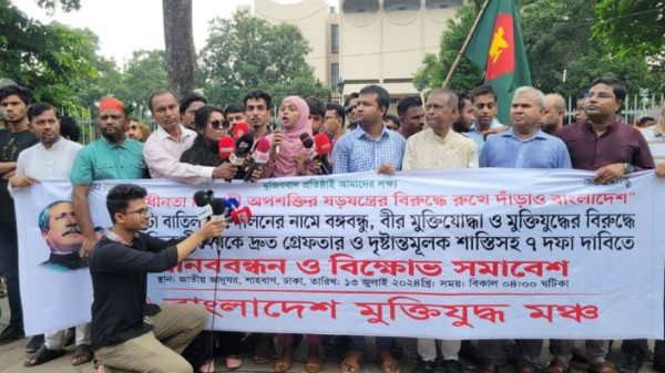 নিজস্ব প্রতিবেদক: কোটা বাতিল আন্দোলনের নামে বঙ্গবন্ধু, বীর মুক্তিযোদ্ধা ও মুক্তিযুদ্ধের বিরুদ্ধে কটূক্তিকারীদেরকে দ্রুত গ্রেপ্তার এবং দৃষ্টান্তমূলক শাস্তিসহ ৭ দফা দাবিতে শাহবাগে মানববন্ধন ও বিক্ষোভ সমাবেশ করছে মুক্তিযুদ্ধ মঞ্চ। শনিবার